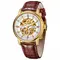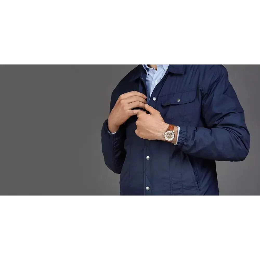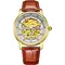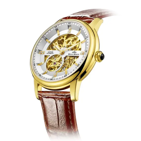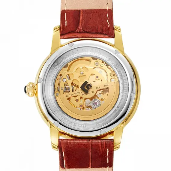 Открытый с обеих сторон японский скелетон ручной сборки — соединение смелого дизайна и передовых рабочих характеристик. Флагманская модель-скелетон появилась на стыке часовых традиций и современных технологий. Сверхточный хронометр собирают вручную из высококачественной стали. Работу его декорированного механизма выгодно демонстрируют сапфировые стекла, установленные с двух сторон. 42 миллиметровый корпус дополняет белый циферблат с наклонными поверхностями. В его облик гармонично вписываются прямоугольные золотистые индексы. Владельцы получают часы с ремнем из натуральной итальянской кожи, стилизованной под крокодила, с надежной застежкой.
