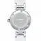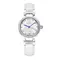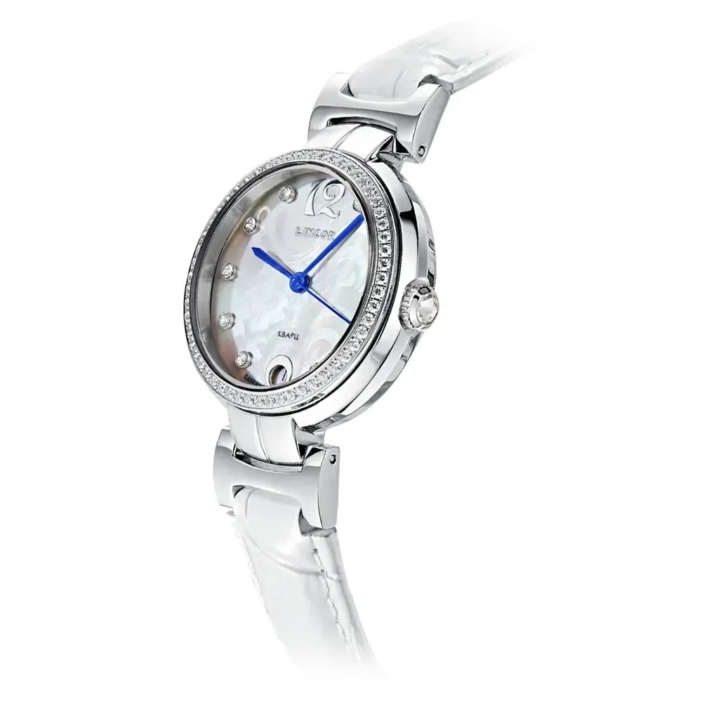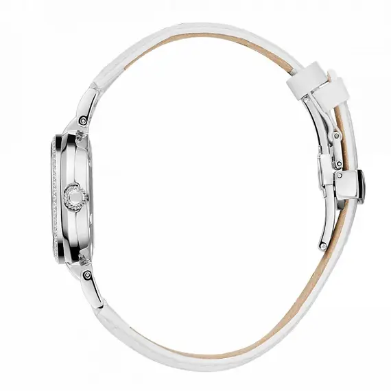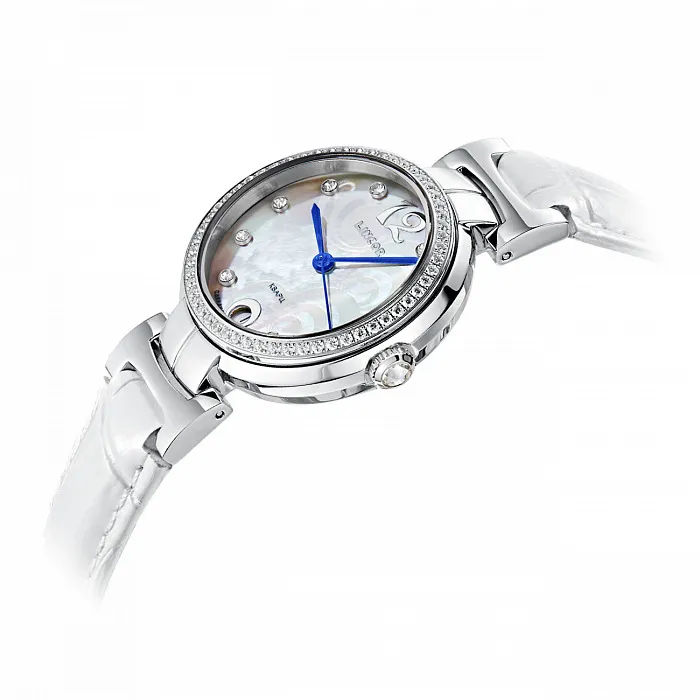 Инкрустированный фианитами рант выделяет циферблат и привлекает внимание к часам. Еще 10 блестящих фианитов под сапфировым стеклом заменяют часовые индексы. Гильошированный кругами перламутровый циферблат украшают контрастные синие стрелки.