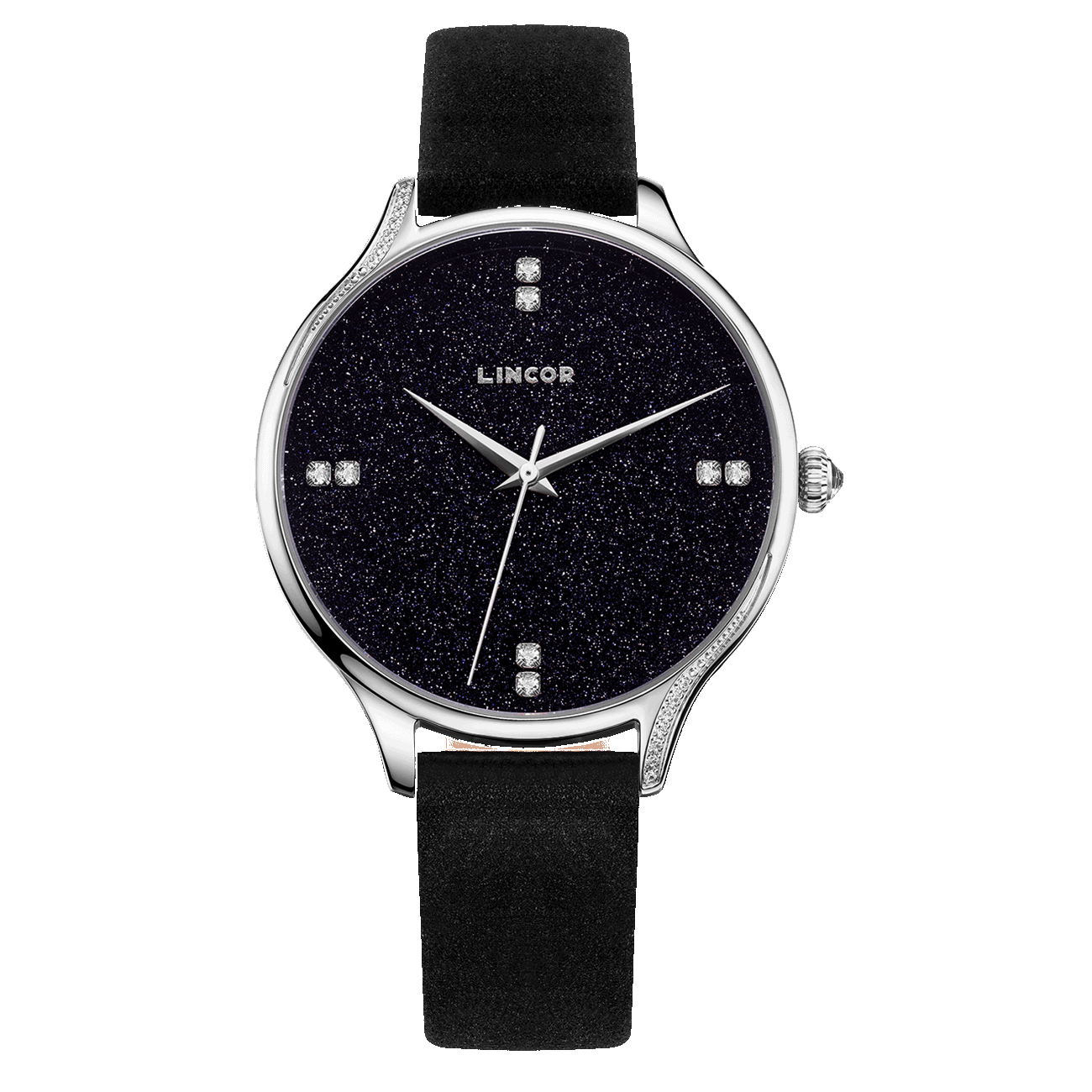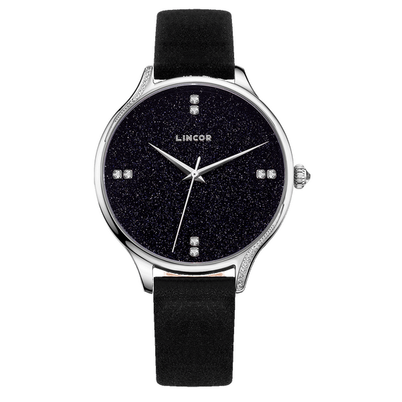 Звездное небо на твоей руке. Сияющий циферблат, напоминающий сияние звезд. Часовые индексы заменяет инкрустация фианитами, а защищает эту игру света надежное сапфировое стекло. Модели комплектуются изящным замшевым ремешком черного цвета.