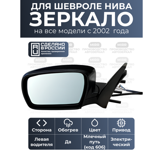Левое боковое зеркало с накладкой цвета Млечный Путь для Нива Шевроле GM 2123 (код краски 606) серебристо-серо-графитовый. Зеркало нового образца (рестайлинг) штатной установки на автомобили Schevrolet. Зеркало оснащено электроприводом и обогревом. Заводские зеркала на автомобиль / Travel. Производство Россия.
