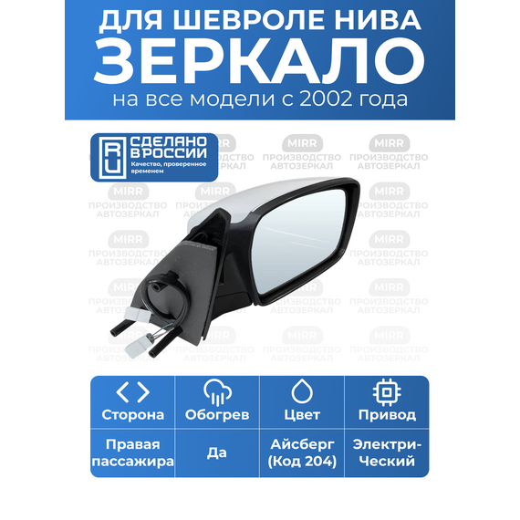 Боковое зеркало заднего вида в машину с накладкой цвета Айсберг (код цвета 204) для Нива Шевроле 2123 (правая сторона). Это зеркало заднего вида нового образца (рестайлинг), предназначенное для штатной установки на автомобили Schevrolet. Зеркало оснащено обогревом зеркала и электроприводом, что обеспечивает комфорт и безопасность в любых погодных условиях. Подходит для моделей Тревел. Зеркало автомобильное произведено в России, соответствует высоким стандартам качества.