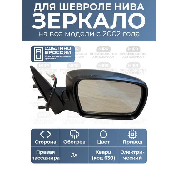 Боковое зеркало заднего вида в машину с накладкой цвета Кварц (код краски 630 ) для Нива Шевроле 2123 (правая сторона). Это зеркало заднего вида нового образца (рестайлинг), предназначенное для штатной установки на автомобили Schevrolet. Зеркало оснащено обогревом зеркала и электроприводом, что обеспечивает комфорт и безопасность в любых погодных условиях. Подходит для моделей Тревел. Зеркало автомобильное произведено в России, соответствует высоким стандартам качества.