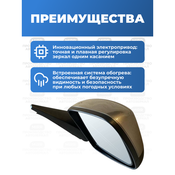 Ключевая особенность - электропривод, который позволяет удобно регулировать угол обзора. Обогрев зеркала обеспечивает отличную видимость зимой, предотвращая запотевание и образование снега.