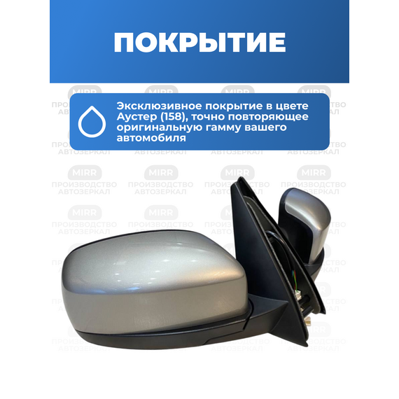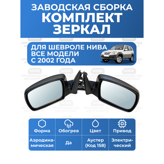 Комплект боковых зеркал заднего вида в машину с накладками цвета Аустер (код краски 158, серебристо-серо-графитовый) для Шевроле НИВА Schevrolet (GM 2123). В набор входят левое и правое зеркала заднего вида нового образца (рестайлинг), предназначенные для штатной установки на автомобили. Зеркала оснащены обогревом зеркал и электроприводом, что обеспечивает комфорт и безопасность в любых погодных условиях. Подходят для моделей Нива Шевроле Тревел. Зеркала автомобильные произведены в России, соответствуют заводским стандартам качества.