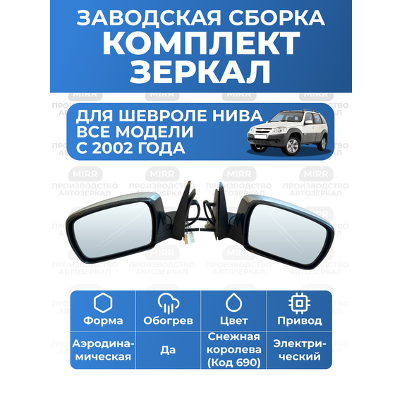 Комплект боковых зеркал заднего вида в цвете Снежная королева (код краски 690) для Нива Шевроле (GM 2123). В набор входят левое и правое зеркала заднего вида нового образца (рестайлинг), предназначенные для штатной установки на автомобили. Зеркала оснащены обогревом зеркал и электроприводом, что обеспечивает комфорт и безопасность в любых погодных условиях. Подходят для моделей Нива Шевроле Тревел. Зеркала автомобильные произведены в России, соответствуют заводским стандартам качества.