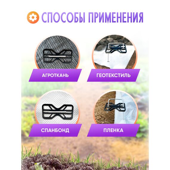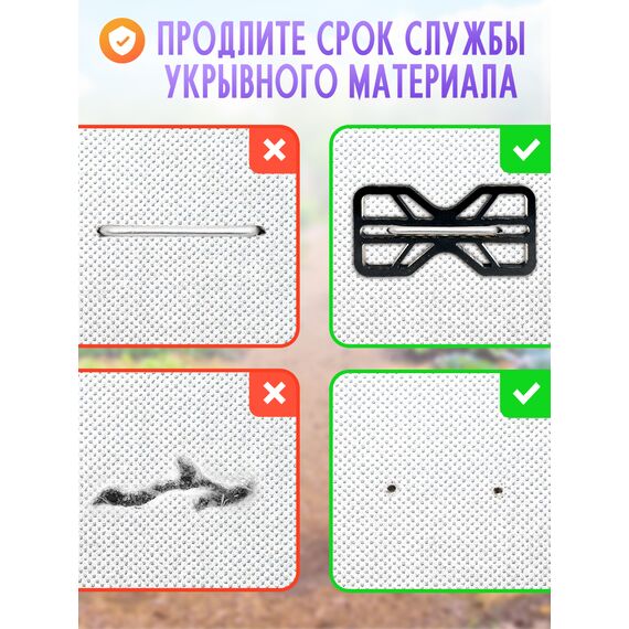 Прямоугольные фиксаторы предназначены для крепления укрывного материала с использованием садовых скоб, которые можно приобрести отдельно. Специальный пластиковый материал предотвращает разрыв геотекстиля и пленки при прижатии к земле, обеспечивая надежную защиту растений от ветра, дождя и холода.