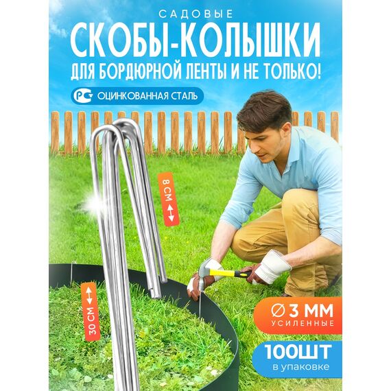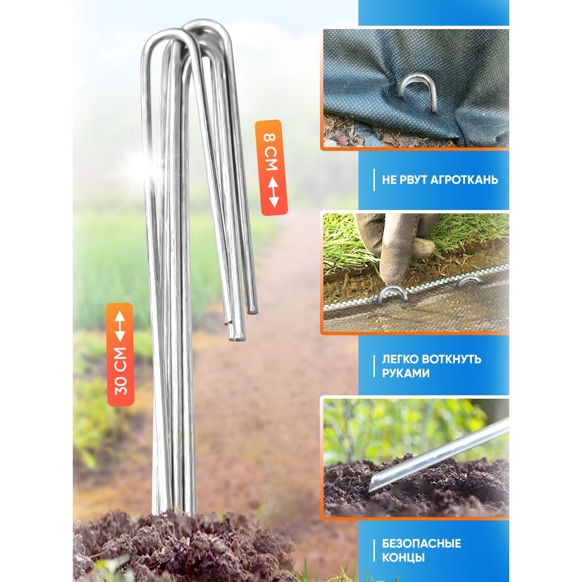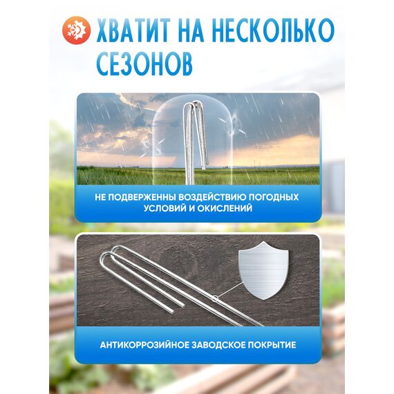 Благодаря достаточной жесткости скобы глубоко входят в почву, обеспечивая надежную фиксацию на любых грунтах, включая плотные и каменистые. Их универсальность позволяет использовать не только для крепления бордюрной ленты, но и для фиксации укрывного материала, агротекстиля, георешетки, газонной решетки, сетки от кротов и различных пленок. Скобы также идеально подходят для установки палаток, тентов, теплиц, закрепления шлангов и других садовых и хозяйственных конструкций. Также они могут служить в качестве надежной опоры для растений, таких как перцы, помидоры, огурцы, цветы и рассада. Зимой они помогут предотвратить срыв геотекстиля сильным ветром, сохраняя посадки под надежной защитой.