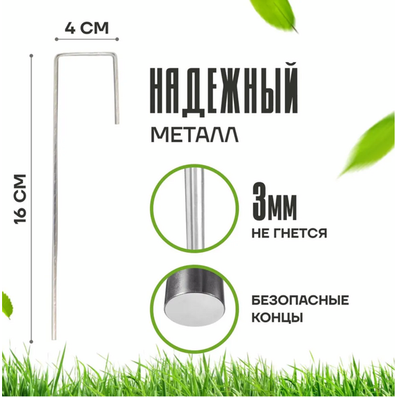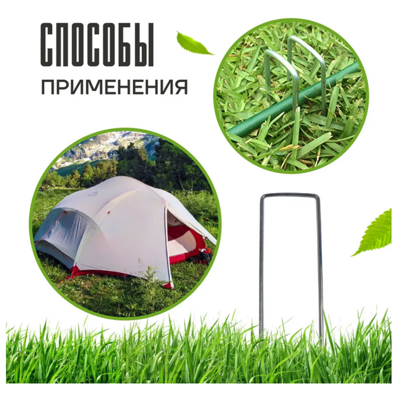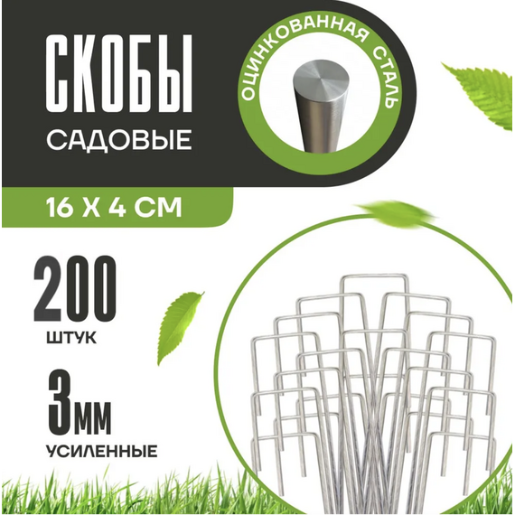 Садовые скобы, держатели для геотекстиля металлические из оцинкованной стали. Скобы предназначены для фиксации мембран для сада, всех вариантов агротекстиля, газонных георешеток, сетки металлической (или пластиковой) от кротов, укрывного нетканного материала, идеально подходят для укрепления стыков материала внахлест. Приспособление в виде арки, дуги закрепляют агротекстиль для укрывания цветов (роз, пионов, лаванды и др.) на зиму, мульчирования клубники, томатов, гороха и других вьющихся растений. Обеспечивают надежное крепление, применяются для различных по плотности и твердости грунтов. Изготовлены из прочного металла, не гнутся, не деформируются. Могут быть использованы для усиления подпорки кустов, закрепления шланга к земле для огорода или душа дачного, как колышки для палатки. Они глубоко входят в почву, благодаря чему не мешают при кошении травы триммером. Высота каждой скобы-фиксатора составляет 16 см. Она оптимальна для качественного крепежа даже в мягком, сильно разрыхленном грунте. Г - образная форма увеличивает прочность крепления