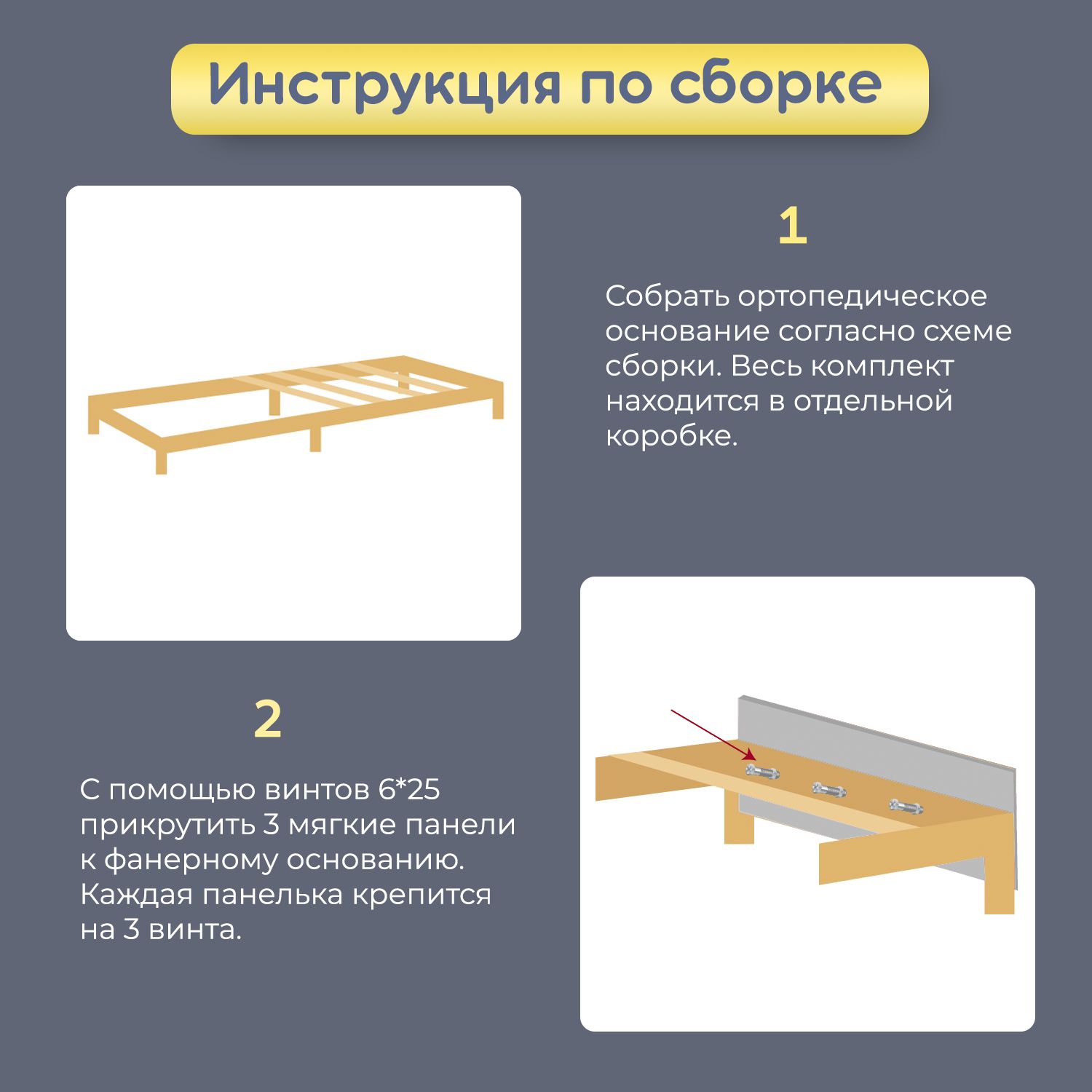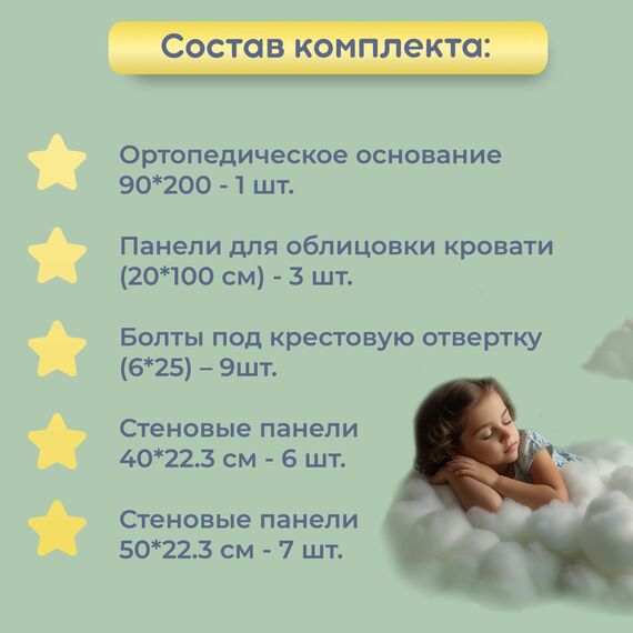 В комплект кровати "Печеньки" входит: каркас кровати, мягкие стеновые панели, разборное основание, комплект крепежа и инструкция по сборке!