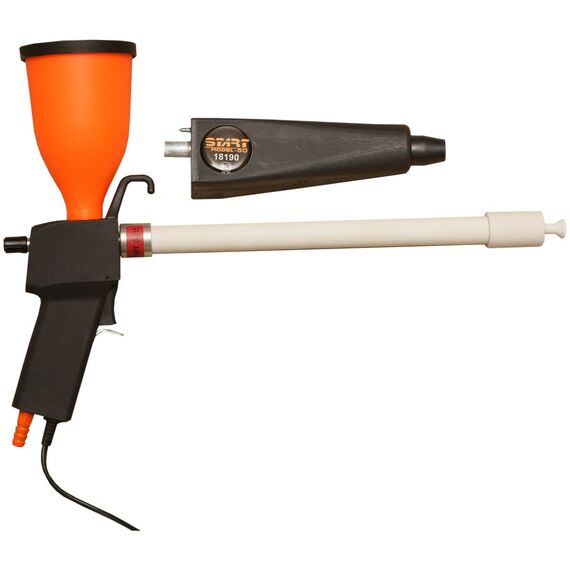 Комбинированный пистолет-распылитель "Старт-50-комби" с воронкой и двумя стволами в комплекте – трибостатическим и электростатическим. Позволяет работать как в режиме трибостатики, так и в режиме электростатики в зависимости от поставленных задач и конфигурации изделия.