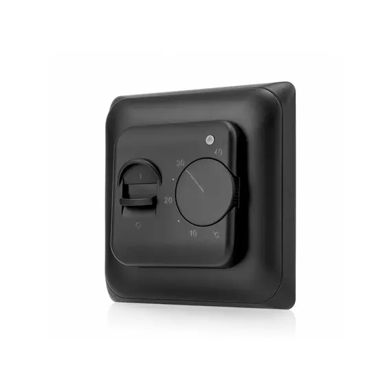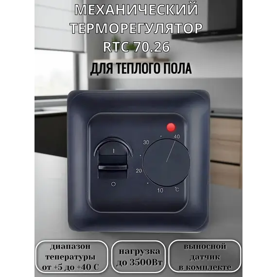 Терморегулятор механический c датчиком температуры пола предназначен для регулирования и поддержания установленной температуры полов с подогревом (для управления электрическими отопительными приборами такими как инфракрасные обогреватели, конвекторы). Терморегулятор для теплого пола RTC 70.26 прост и надёжен в использовании. **Имеет широкий диапазон установки температуры от +5 C до +40 C.** У механического термостата очень простой функционал в интерфейс ничего лишнего: кнопка вкл/выкл и колесико с выставлением температуры.Термостат комнатный сделан в эргономичном (встраивается в стандартную монтажную коробку) и стильном дизайне - подойдет под любой интерьер. Выносной датчик пола имеет длину 3 метра, его также можно укорачивать или наращивать. Терморегулятор с датчиком температуры с классом защиты IP-20 рекомендуется не подвергать воздействию воды.