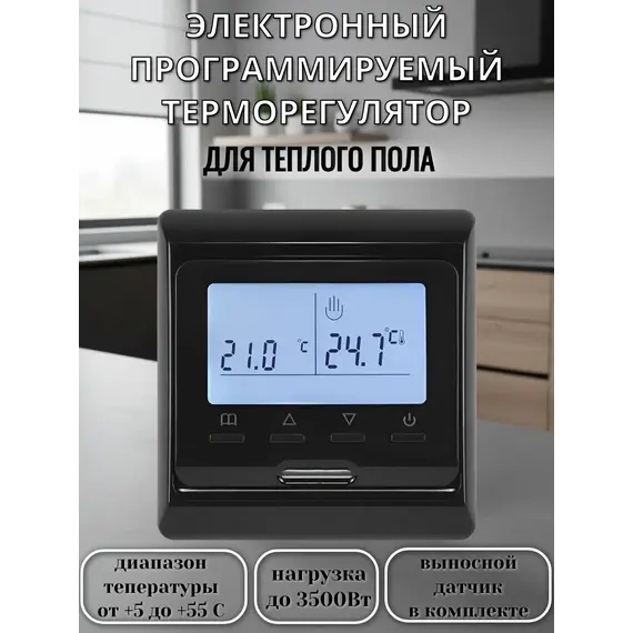 Температурный датчик : 1 встроенный в корпус для измерения температуры воздуха + 1 выносной (длина 3 метра) для теплых полов