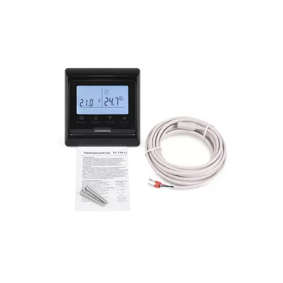 Терморегулятор RTC 51.716, выносной датчик температуры теплого пола, два винта для крепления, инструкция по эксплуатации, коробка