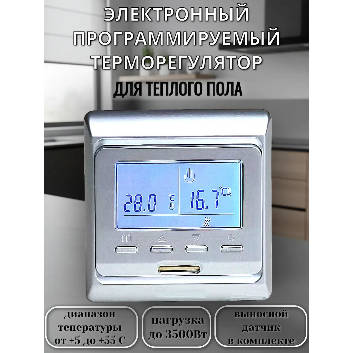 Температурный датчик : 1 встроенный в корпус для измерения температуры воздуха + 1 выносной (длина 3 метра) для теплых полов
