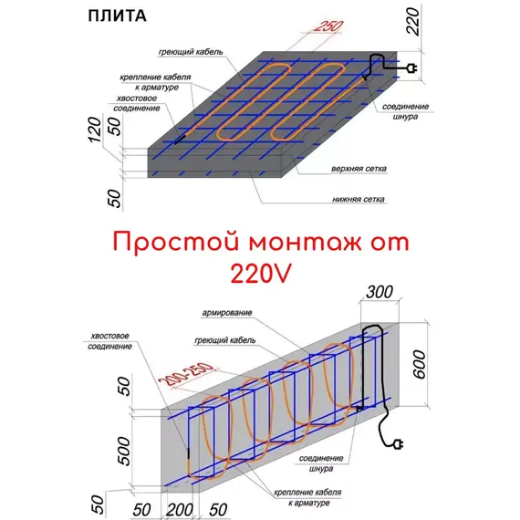 кВт (от 0,8 до 1,5 кВт) мощностb. Нагревательная секция подключается напрямую к питающему напряжению 220 Вольт. После набора бетоном прочности установочный (питающий) кабель отрезается.