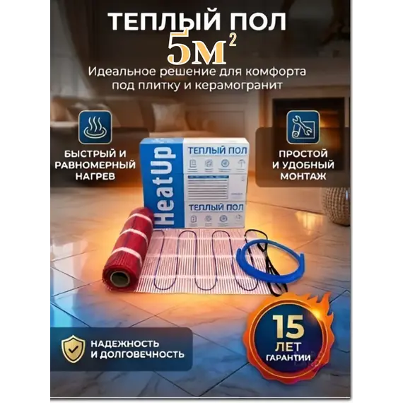 Теплый пол под плитку HeatUp 5,0 м2 - 750 ВтНагревательный мат HeatUp 5,0 м2 - 750 Вт - инновационное решение для вашего дома, теплый пол под плитку или под керамогранит, идеальное сочетание комфорта и эффективности! Забудьте о холодных полах под ногами! Наш нагревательный мат обеспечивает равномерный нагрев и радует приятной теплотой.