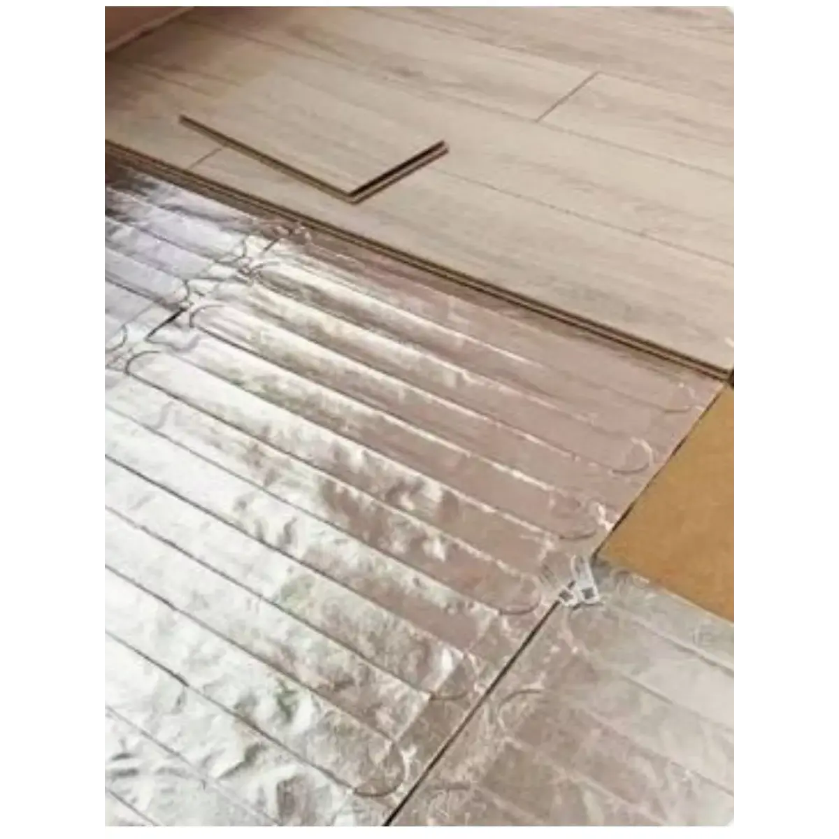 Фольгированный мат не требует заливки даже минимальным слоем строительных смесей (стяжки и плиточного клея), и поэтому используется не под плитку, а под «плавающие» покрытия, такие как ламинат, ковролин, линолеум, паркетную доску, плитку ПВХ.