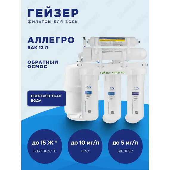 Технология обратного осмоса, использованная в фильтре Гейзер Аллегро, заключается в фильтрации воды через полупроницаемую мембрану. Размеры пор мембраны настолько малы, что пропускают только молекулы воды. Размер молекул большинства примесей, а также бактерий и вирусов значительно больше молекул воды, поэтому они не проходят через мембрану. Система работает при давлении в подводящей магистрали не менее 3 атм.