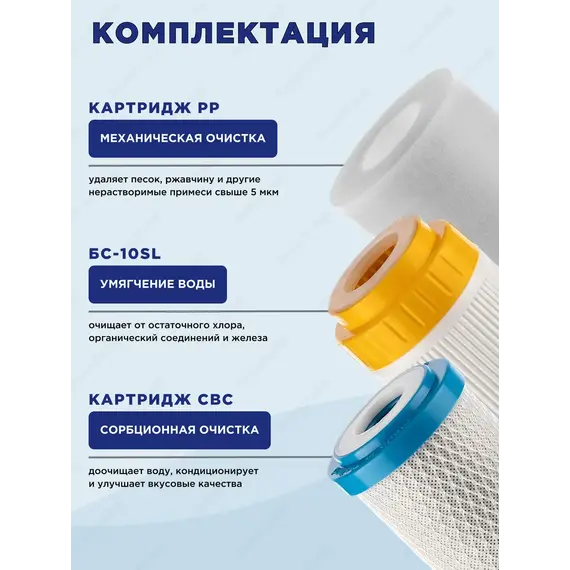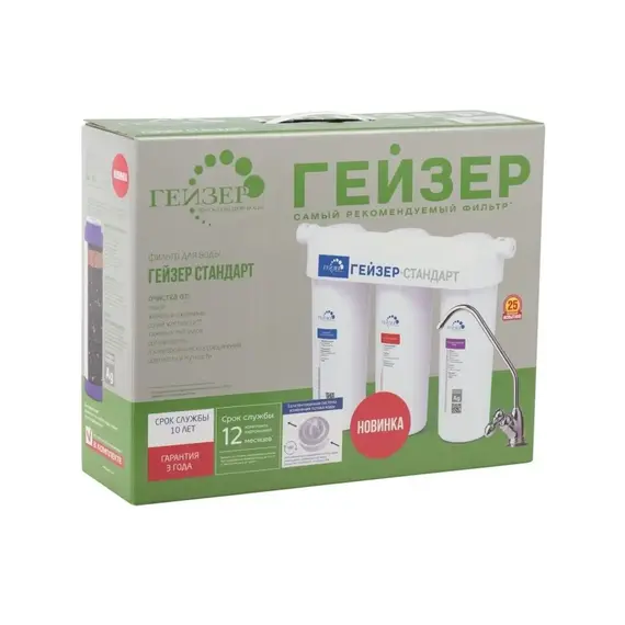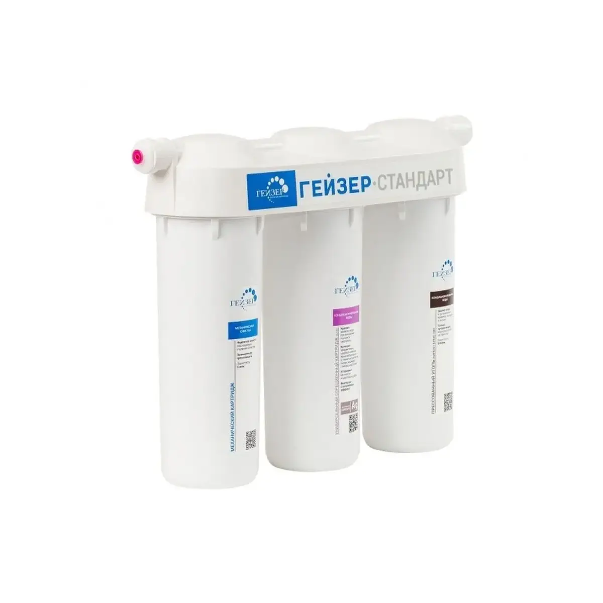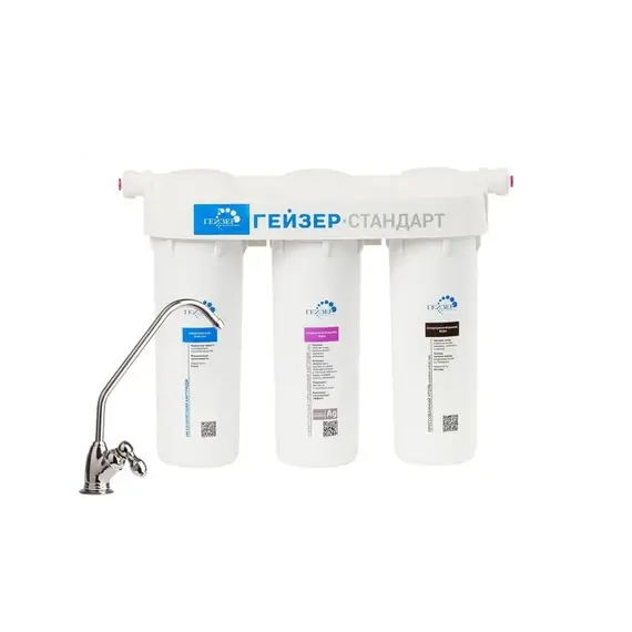 Фильтр для воды Гейзер Стандарт для мягкой воды состоит из 3 картриджей: Осадочный картридж РР - удаляет нерастворимые частицы размером до 5 мкм (ржавчина, взвеси); БАФ - универсальный картридж для удаления хлора, органических примесей, железа и тяжелых металлов. Содержит серебро; СВС 1 - для удаления хлора, запахов, органических примесей и кондиционирования воды. Оптимальное сочетание цена - качество. Идеальное решение для очистки мягкой воды. Все необходимое для подключения фильтра Гейзер Стандарт в комплекте. Замена картриджей для семьи из 3-4 человек в среднем 1 раз в год. Рекомендуемая скорость фильтрации не более 3 л/мин. Рабочее давление не менее 0,5 атм. Температура воды не более 40 С.
