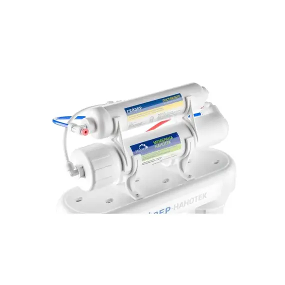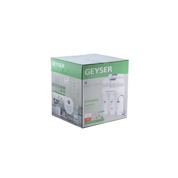 Гейзер Нанотек — это мембранный фильтр, конструктивно схожий с системами обратного осмоса. Основным его отличием является мембрана. Размер её пор в 0,001 мкм находится посередине между порами обратноосмотических и ультрафильтрационных мембран. Это позволяет получить воду высокой степени очистки, но в то же время избежать её полного обессоливания. Гейзер Нанотек способен снизить содержание солей жесткости в воде на 80%, что обеспечит отсутствие накипи в чайниках, а также защитит утюги, кофемашины и другую бытовую технику.