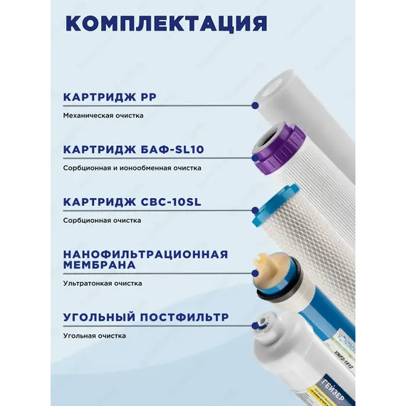 Нанофильтрационная мембрана — удаление всех примесей, включая бактерии и вирусы. Ресурс 1-3 года (зависит от качества воды).