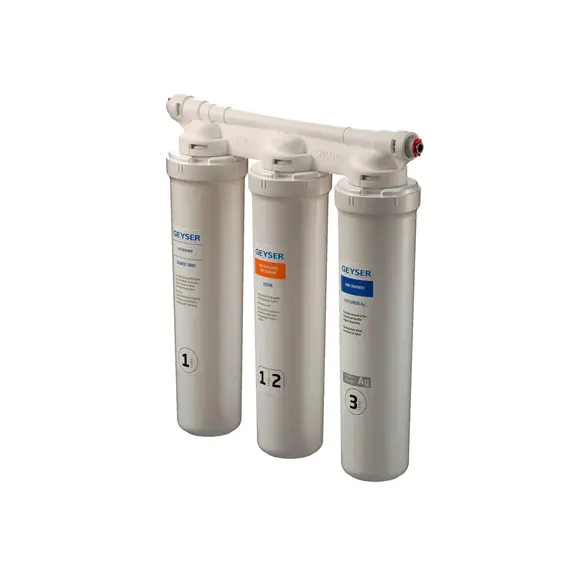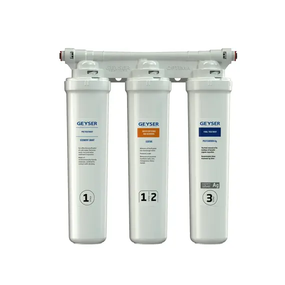 Фильтр Гейзер Оптима Старт предназначен для доочистки водопроводной воды от примесей, таких как железо, бактерии, хлорорганические и органические примеси, хлор, тяжелые металлы и механические частицы, избыток солей жесткости. Фильтр Гейзер предотвращает образование накипи. Улучшает органолептические показатели воды: вкус, цвет и запах. Очистка воды проходит в три этапа: механика Смарт – вспененный полипропиленовый картридж для механической очистки питьевой воды от нерастворимых примесей – ржавчины, песка и других, Экотар Смарт — смесь ионообменных смол пищевого класса для высокоэффективного удаления солей жесткости (накипи), железа и марганца, посткарбон Ag Смарт – содержит высококачественный кокосовый уголь и материал Каталон. Удаляет хлор, органические и хлорорганические соединения. Улучшает вкус, цвет, прозрачность воды и устраняет посторонние запахи. Содержит серебро.