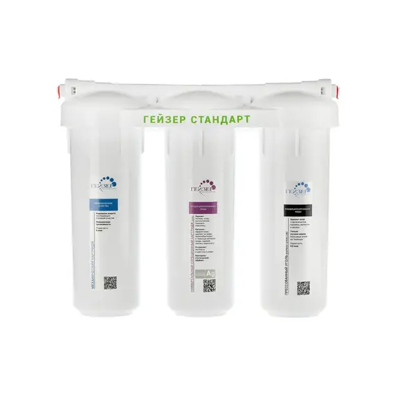 Фильтр для воды Гейзер Стандарт для мягкой воды состоит из 3 картриджей: Осадочный картридж РР - удаляет нерастворимые частицы размером до 5 мкм (ржавчина, взвеси); БАФ - универсальный картридж для удаления хлора, органических примесей, железа и тяжелых металлов. Содержит серебро; СВС 1 - для удаления хлора, запахов, органических примесей и кондиционирования воды. Оптимальное сочетание цена - качество. Идеальное решение для очистки мягкой воды. Все необходимое для подключения фильтра Гейзер Стандарт в комплекте. Замена картриджей для семьи из 3-4 человек в среднем 1 раз в год. Рекомендуемая скорость фильтрации не более 3 л/мин. Рабочее давление не менее 0,5 атм. Температура воды не более 40 С.