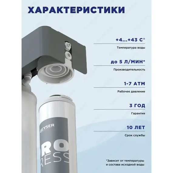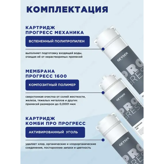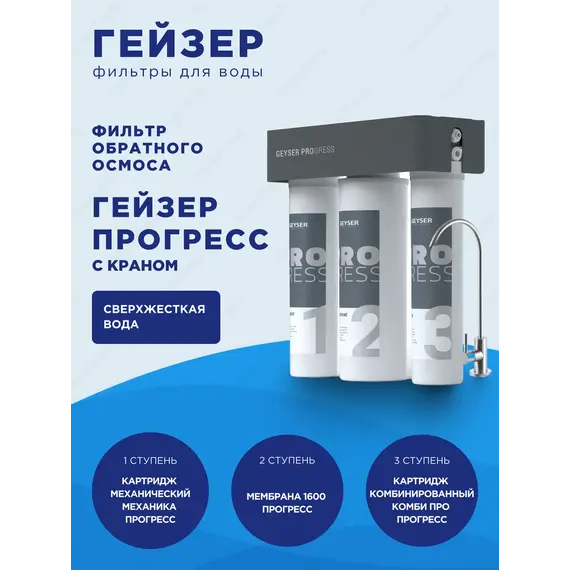 Фильтр с обратным осмосом Гейзер ПРОГРЕСС включает следующие ступени фильтрации: