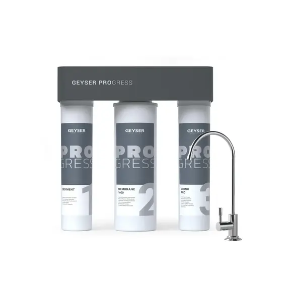 Прямоточная система обратного осмоса Гейзер ПРОГРЕСС – мембранный фильтр нового поколения. Он сочетает компактность и технологичность: высочайший уровень очистки обратноосмотической мембраны и принцип устройства трехступенчатого фильтра. Фильтр ПРОГРЕСС входит в число рекордсменов бытовых систем обратного осмоса Преимущества: