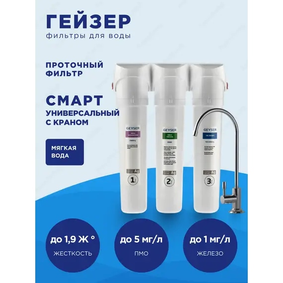* Все необходимое для подключения в комплекте* Компактная система **Гейзер Смарт** обеспечивает гарантированно высокую и эффективную степень очистки воды на протяжении всего срока службы. Благодаря сочетанию ионообменной смолы пищевого класса, а также кокосового активированного угля с добавкой серебра и материала , фильтр Гейзер Смарт удаляет все нежелательные загрязнения, умягчает воду и делает её безопасной и полезной для здоровья. Наличие быстросъемных фильтрующих модулей обеспечивает простоту и удобство обслуживания фильтра.
