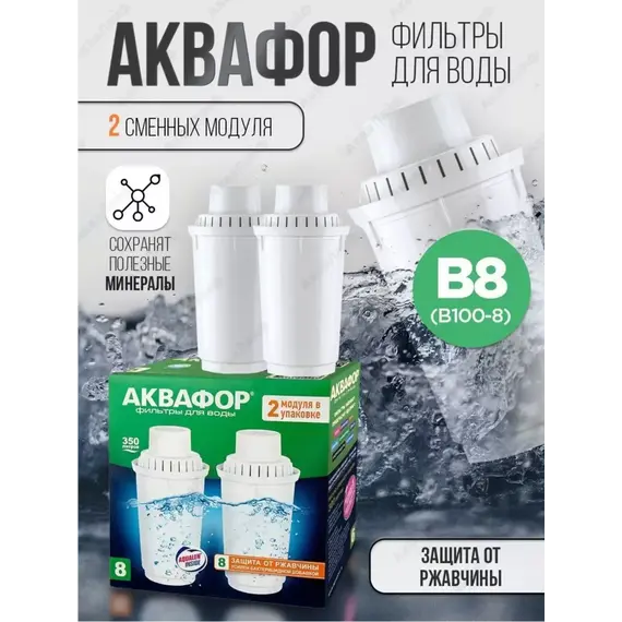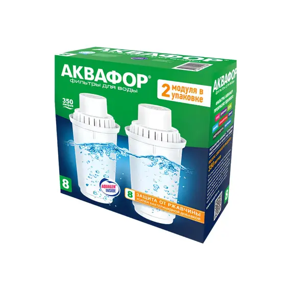 Ресурс каждого модуля в комплекте - 350 литров. Когда один закончится, вы сможете заменить его за несколько минут. С картриджем (В100-8) в фильтре-кувшине, у вас всегда есть свежая чистая вода, чтобы готовить для ваших близких.С картриджами (В100-8) в вашем фильтре кувшине, на кухне всегда будет чистая безопасная вода, чтобы готовить для близких.Модуль (В100-8) эффективно удаляет соединения железа, что дает повышенную защиту от ржавчины.Используется в кувшинах Аквафор c круглым гнездом посадки картриджадиаметром 7 см.
