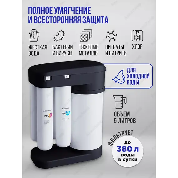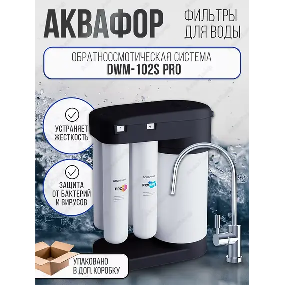 Система Аквафор DWM-102S Pro - улучшенная система обратного осмоса, которая очистит водопроводную воду от самых сложнейших загрязнений, включая бактерии, вирусы, токсины, а также абсолютно умягчит жесткую воду. Фильтрованную воду можно пить без кипячения. В комплектацию входят модули: Pro1 - сочетает механическую и сорбционную очистку воды на первой ступени, что повышает грязеемкость, задерживает часицы размером от 10 до 3 мкм. Замена раз в 6 мес. Pro 2 - системе DWM -102S Pro выполняет функцию второй ступени предварительной очистки. Угольный фильтр удаляет активный хлор и тяжелые металлы, задерживает частицы до 1 мкм. Замена раз в 6 мес. Pro-100 - обратноосмотическая мембрана, обеспечивает абсолютное умягчение воды и защиту от бактерий и простейших. Замена раз в 1,5-2 года. ProBMg - карбонблок, половолоконная мембрана и минерализатор - доочищает воду и минерализует ее. Замена раз в год. Объем накопительного бака - 5л, производительность 380л/сут (15л/ч), рабочее давление от 2 ат.