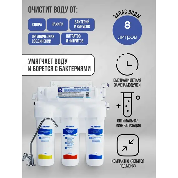 Аквафор Осмо 50 исп. 5 эффективно умягчает воду и борется с бактериями. Свободно используйте чистую воду для питья, кулинарии, детского питания и домашней бытовой техники. Аквафор Осмо 50 исп. 5 полностью удаляет из воды соли жесткости, а значит обеспечит долгий срок службы кофе-машине, чайнику, мультиварке, утюгу и отпаривателю. Увлажнитель воздуха перестанет покрывать мебель белым налетом.
