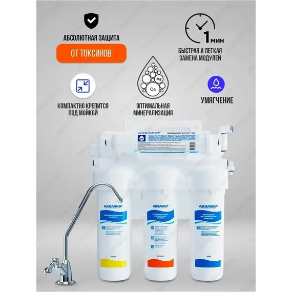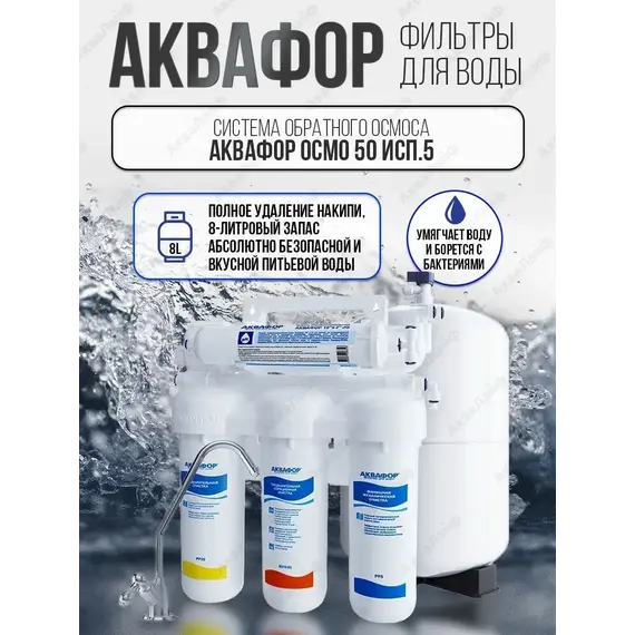 Аквафор Осмо 50 исп. 5 эффективно умягчает воду и борется с бактериями. Свободно используйте чистую воду для питья, кулинарии, детского питания и домашней бытовой техники. Аквафор Осмо 50 исп. 5 полностью удаляет из воды соли жесткости, а значит обеспечит долгий срок службы кофе-машине, чайнику, мультиварке, утюгу и отпаривателю. Увлажнитель воздуха перестанет покрывать мебель белым налетом.Характеристики фильтра:- Ширина, см 42,0- Глубина, см 19,0- Обратный осмос- Число ступеней очистки 5- Минерализация- Постфильтрация- Давление в водопроводе не менее, атм 3,5- Давление в водопроводе не более, атм 6,5.