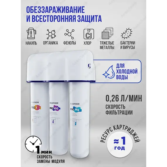 АКВАФОР "Osmo Pro 100" - это классическая система обратного осмоса с высокой скоростью фильтрации. Классическая система обратного осмоса для большой семьи с детьми, пожилыми и людьми, склонными к аллергиям.Полностью устраняет жесткость, причину накипи, а также все опасные примеси из водопроводной воды, включая бактерии, паразитов и вирусы.