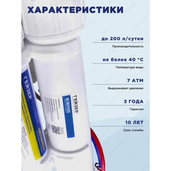 Мембрана обратного осмоса (50 GPD) – выполняет сверхтонкую очистку от солей жесткости, железа, тяжелых металлов, бактерий, вирусов, ядохимикатов, нитритов, радионуклидов, микропластика и др. примесей размером свыше 0,0001 мкм