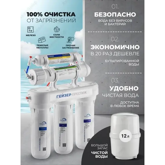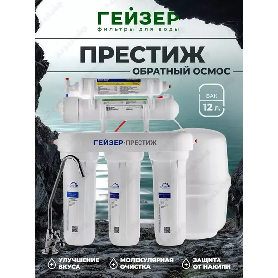 Вода, очищенная фильтром Гейзер Престиж, близка по своим свойствам к талой воде древних ледников, которая признается наиболее экологически чистой и полезной для человека.Технология обратного осмоса, использованная в фильтре Гейзер Престиж, заключается в фильтрации воды через полупроницаемую мембрану. Размеры пор мембраны настолько малы, что пропускают только молекулы воды. Размер молекул большинства примесей, а также бактерий и вирусов значительно больше молекул воды, поэтому они не проходят через мембрану. Система работает при давлении в подводящей магистрали не менее 3 атм