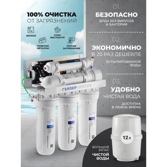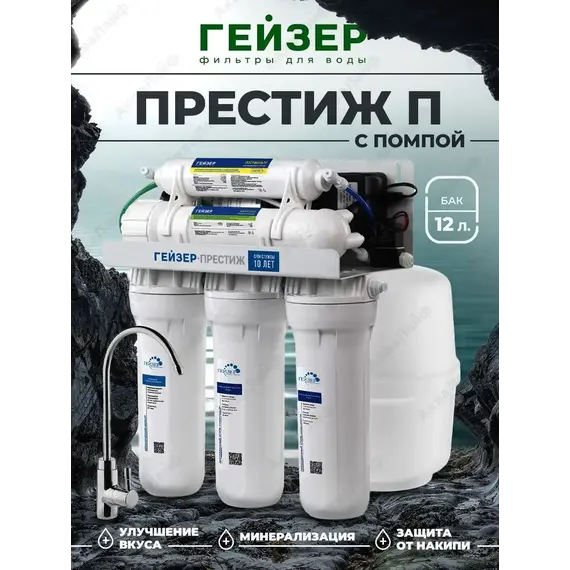 **Гейзер Престиж П бак 12л**В комплектации есть помпа, повышающая давление, используется при давлении в водопроводе не менее 2 атм.**Внимание : для подключения системы перед приздом мастера должна быть установлена эл.розетка для подключения помпы !!!**Полезный объем бака 7-8 литров.**1,2,3 ступени** - ступени предочистки ( комплект картриджей №6). Картриджи защищают ресурс мембраны от механических примесей, а также очистка от хлора, улучшение цвета и запаха воды.**4ступень Мембрана** - Обратноосмотическая мембрана Гейзер 2012-100 основа очистки воды систем обратного осмоса. Размер поры сравним с размером молекулы воды, поэтому сквозь нее могут пройти соединения только меньше ее. Последняя разработка с дополнительным защитным слоем, что увеличивает срок ее службы.**5ступень Постфильтр** - улучшает вкус и цвет очищенной воды, удаляет остатки хлора и неприятные запахи. Создан компанией Гейзер по технологии карбон-блок. Угольный постфильтр можно заменять на минерализатор. Кран исп.6.