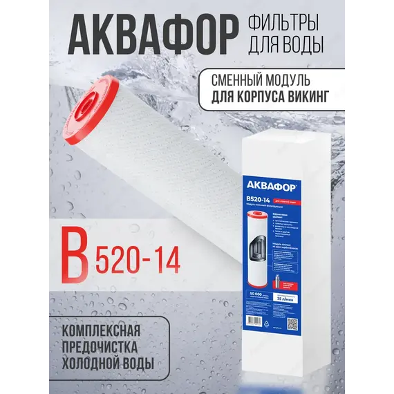 Сменный модуль B520-14. Сменный модуль для очистки горячей воды от хлора, растворенных органических соединений и токсинов. Имеет повышенную грязеемкость, эффективно справляется с коллоидным и растворенным железом. Практически не снижает давление в водопроводе. Доступен в трех размерах для моделей Викинг, Викинг Миди и Викинг Мини. Модуль обеспечит максимальный ресурс, вам не придется часто производить замену, если семья большая или в воде много механических загрязнений.