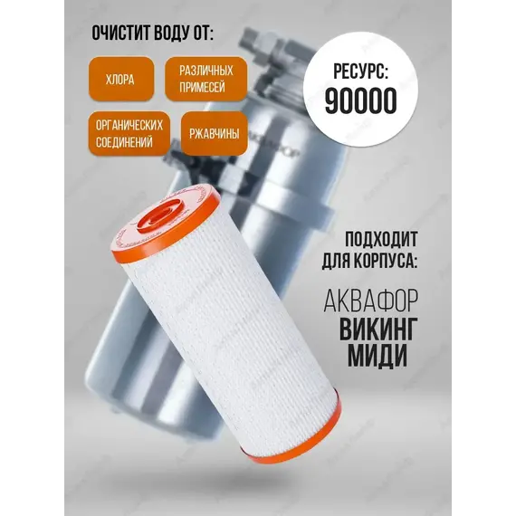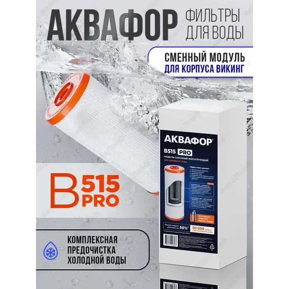 Сменный модуль В515 PRO для магистрального водоочистителя ''Викинг Миди'', который используется в предочистке холодной воды. Картридж состоит из двух слоев. Благодаря им из воды одновременно удаляется ржавчина, коллоидное железо, песок, другие видимые загрязнители, а также растворенные примеси, органические соединения, тяжелые металлы, хлор и другие токсины и аллергены. Внешний слой модуля сделан на основе сорбционного материала нового поколения, ''Аквален 4'' и мелкого активированного кокосового угля. Инновационные разработки в каждом фильтрующем слое увеличивают ресурс B515 PRO на 50% по сравнению с модулем В515-13.