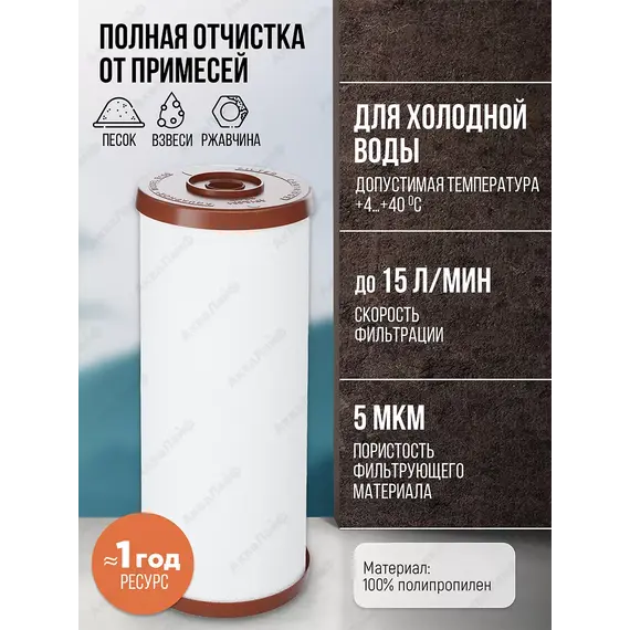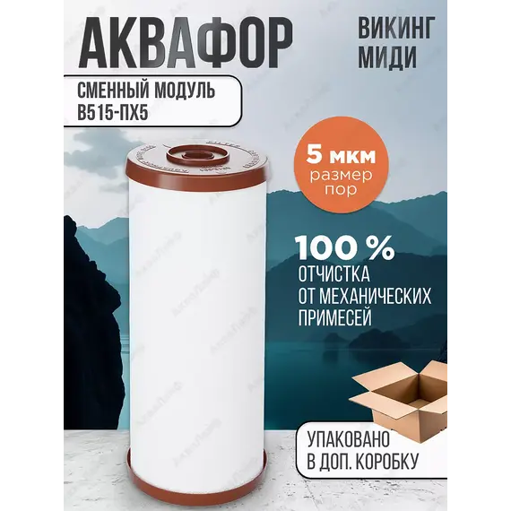 Сменный модуль В515-ПХ5 Используется в системе Аквафор Викинг МидиМодуль сменный фильтрующий Аквафор В515-ПХ5 подходит для очистки холодной воды во всем доме системой Викинг Миди. Задерживает все вредные примеси, бактерии, химикаты. Предотвращает возникновение коррозии на сантехнике. Выполнен из 100% полипропилена. Пористость фильтра - 5 мкм.
