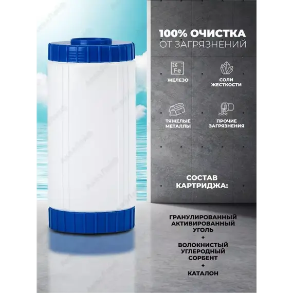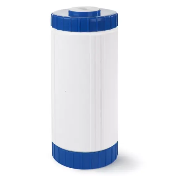 Картридж с мультикомпонентной загрузкой из ионообменных материалов и сорбентов для очистки воды от остаточного хлора, органических соединений, железа (при содержании до 2 мг/л) и других вредных примесей.