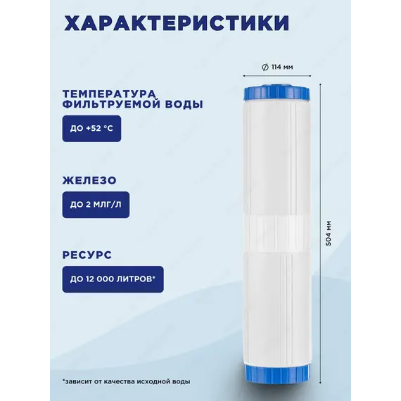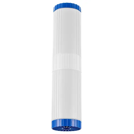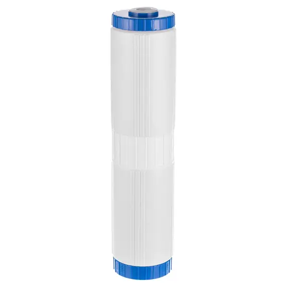 Картридж с мультикомпонентной загрузкой из ионообменных материалов и сорбентов для очистки воды от остаточного хлора, органических соединений, железа (при содержании до 2 мг/л) и других вредных примесей.