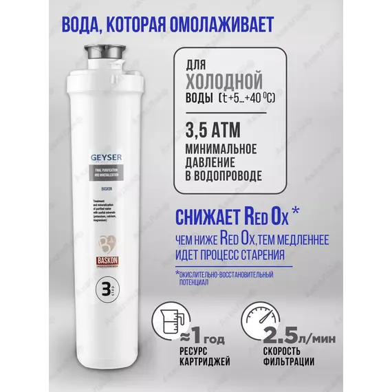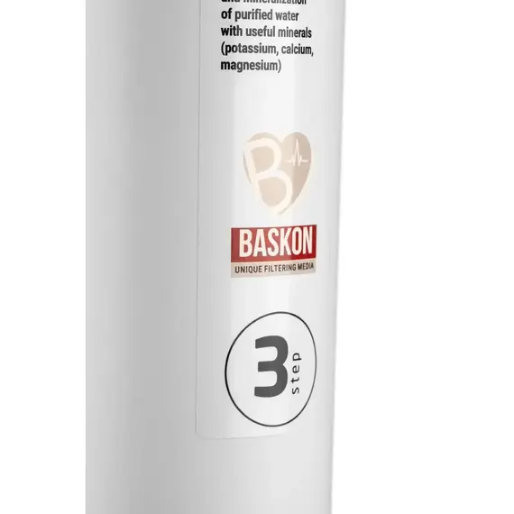 Картридж Баскон Смарт осуществляет финишную очистку и насыщает воду полезными микроэлементами (калий, магний, кальций). Снижает RedOx потенциал и количество свободных радикалов, разрушающих клетки, что положительно влияет на состояние организма.