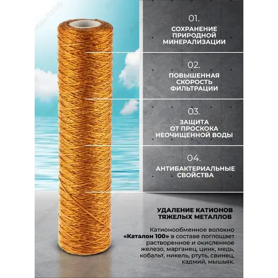 Используется для удаления растворенного и нерастворенного железа, марганца, тяжелых металловвыполнен из катионообменного шнура, используется для очистки от растворенного и нерастворенного железа, марганца, тяжелых металлов. Удаляет нерастворимые примеси размером более 5 мкм. Рекомендуется при содержании растворенного железа до 2 мг/л, марганца до 0,2 мг/л. Восстановлению не подлежит, после окончания ресурса заменяется на новый.КАТАЛОН – инновационный ионообменный волокнистый материал с повышенными сорбционными свойствами (Патент №2531829). Каталон обладает не только хелатными свойствами (выборочное удаление катионов тяжелых металлов), но и амфолитными. Эффективно поглощает из воды все формы железа и марганца, включая коллоидное, тяжелые металлы (свинец, кадмий, мышьяк, ртуть). Соответствует требованиям гигиенической безопасности по стандартам NSF.