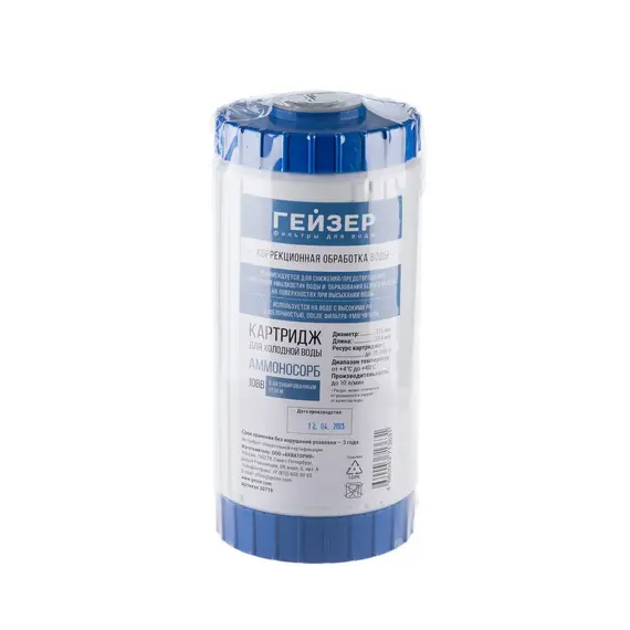 Картридж Гейзер Аммоносорб 10BB предназначен для коррекции качества воды. Его использование рекомендуется для снижения или предотвращения ощущения «мылкости» воды, а также для устранения образования белого налета на поверхностях при высыхании воды.