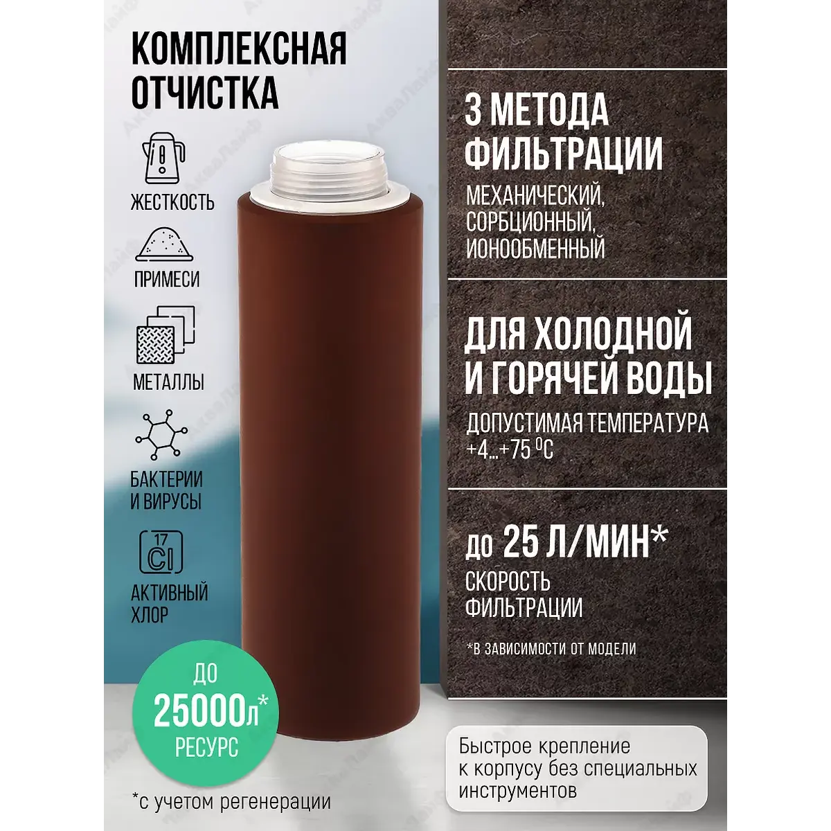 Картридж Арагон-М применяется в бытовом фильтре Гейзер 3 ИВ Люкс для комплексной очистки воды с низким уровнем минерализации.