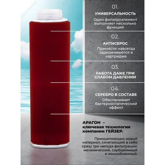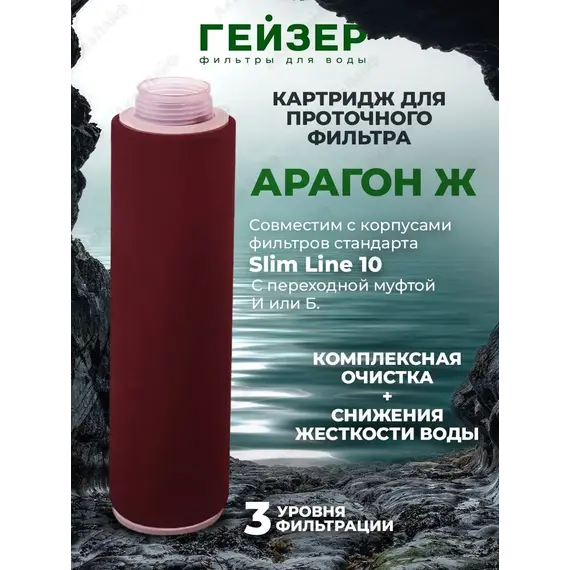Картридж Арагон-Ж используется для комплексной очистки и снижения жесткости воды.Картриджи **Арагон Ж с производительностью 9-11 л/мин** предназначены для установки в настольные фильтры Гейзер.Арагон-Ж - картридж из материала **Арагон**, разработанный для очистки жесткой воды (средний уровень минерализации). Имеет 3 уровня фильтрации (механический, ионообменный и сорбционный).### Обладает важными свойствами:- Антисброс - позволяет необратимо задерживать все отфильтрованные примеси;- Регенерация - фильтрующие свойства картриджа можно восстанавливать в домашних условиях (2-3 регенерации);- **Квазиумягчение** - арагонитовая структура солей жесткости снижает количество накипи, и вода насыщается полезным кальцием.