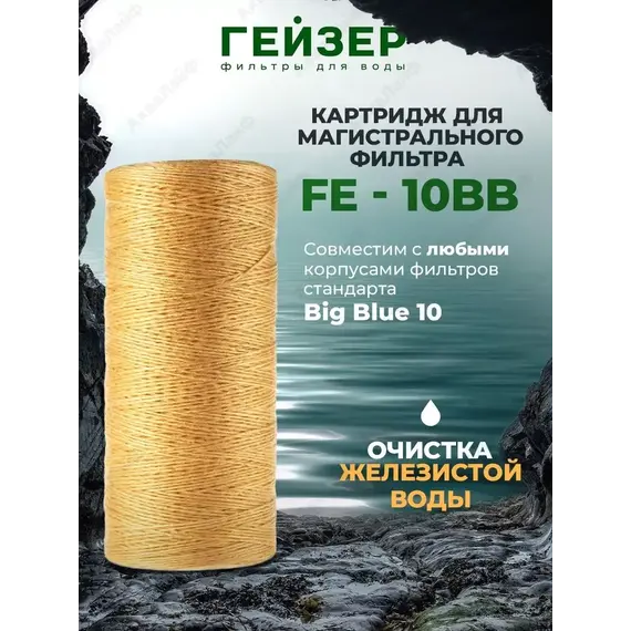 Картридж Гейзер Fe - 10 BB. Картридж Fe - 10BB выполнен из катионообменного шнура. Используется для удаления растворенного и нерастворенного железа, марганца, тяжелых металлов. Рекомендуется при содержании растворенного железа до 2 мг/л. Подходит для корпусов стандарта 10BB (Big Blue) любых производителей. Ресурс до 160 м3 (при содержании растворенного железа 1 мг/л).
