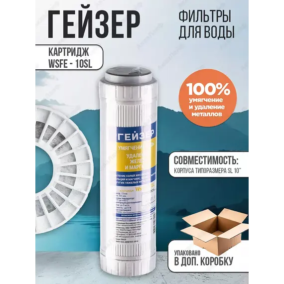 Картридж Гейзер WSFE - 10SL предназначен для удаления солей жесткости (кальция и магния), железа, марганца и других тяжелых металлов.